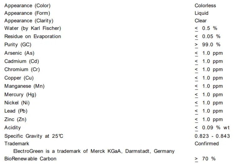 ·ElectroGreen®對于含水量,含酸量以及微量金屬含量都有著嚴(yán)格的控制。以某一批次的異丙醇替代(ElectroGreen®)為例,其中的技術(shù)含量都達(dá)到了ppm級(jí)別,對于電子相關(guān)應(yīng)用的不會(huì)帶來額外的影響。