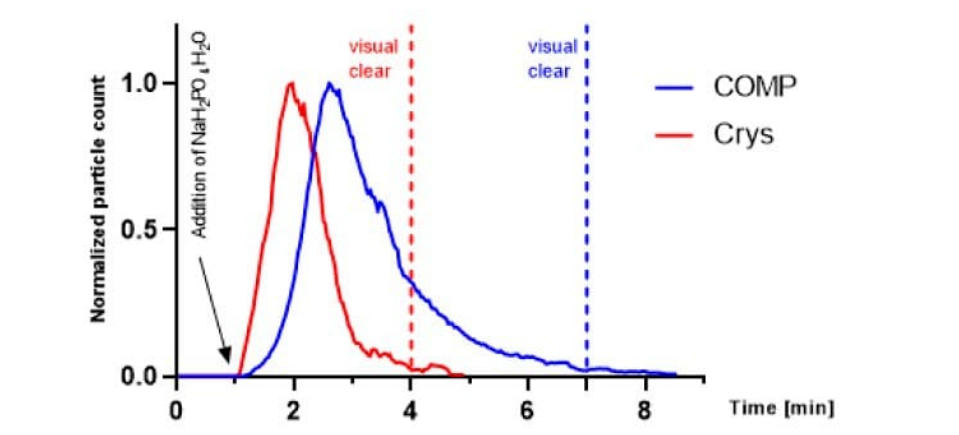 溶解性測試方法簡介:通過將80g的無機鹽溶解在800mL純化水中進行溶解性研究。在室溫下 以250轉/分(rpm)攪拌樣品,并通過聚焦光束反射測量法(FBRM)監測顆粒粒徑變化,該實驗表明,顆粒狀無機鹽的溶解過程波動最小。