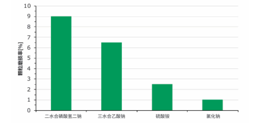 磨損性測試方法簡介:使用裝有陶瓷球的磨損轉鼓對無機鹽的完整性進行測試,以20轉/分(rpm)的速度旋轉10分鐘,然后測定小于500微米的顆粒質量百分比。