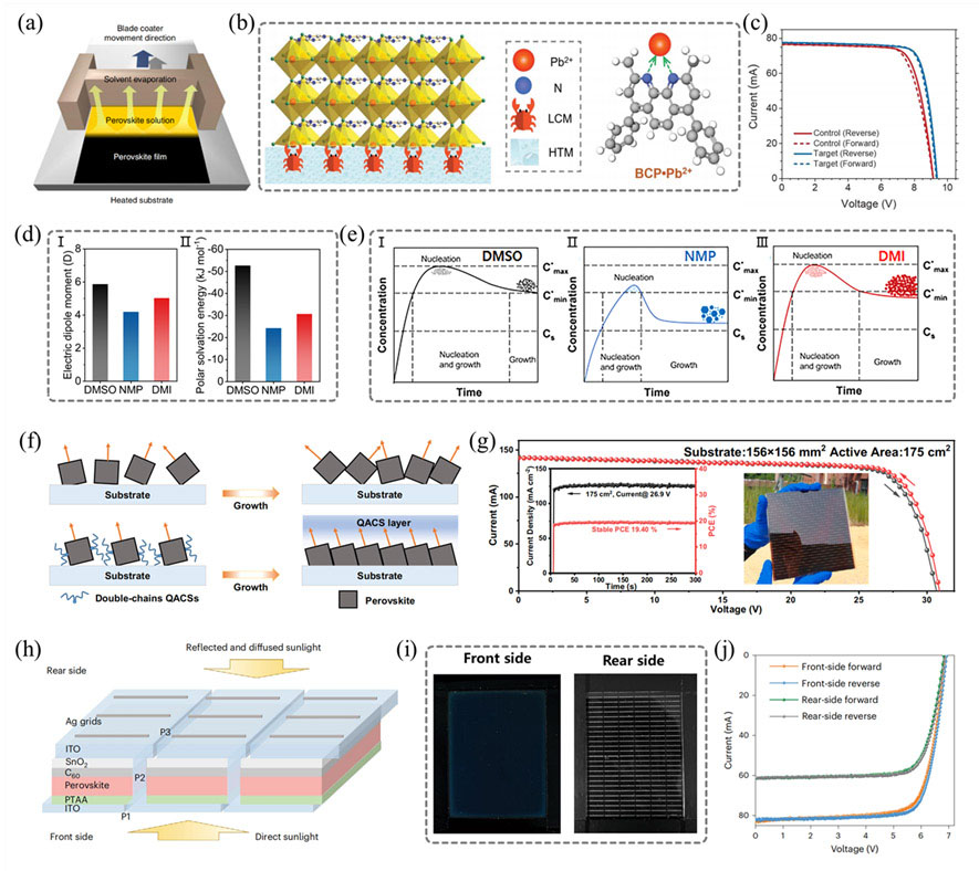 PSC的快速發(fā)展使其成為最有前景的新興光伏技術(shù)。在實(shí)驗(yàn)室規(guī)模的小面積PSC中,它們在效率和穩(wěn)定性方面取得了顯著進(jìn)展。然而,PSC必須升級到模塊規(guī)模,才能成功地向商業(yè)化過渡。在過去的研究中,研究人員已經(jīng)提出了幾種可擴(kuò)展的制造方法來制造PSM。在這一節(jié),簡要總結(jié)了PSM可擴(kuò)展制造在2023年的進(jìn)展,包含刮刀涂覆(圖7)、縫模涂布(圖8)、噴涂法(圖9(a-c))、噴墨打印法(圖9(d-f))、絲網(wǎng)印刷法(圖9(g-h))和氣相沉積(圖10)。