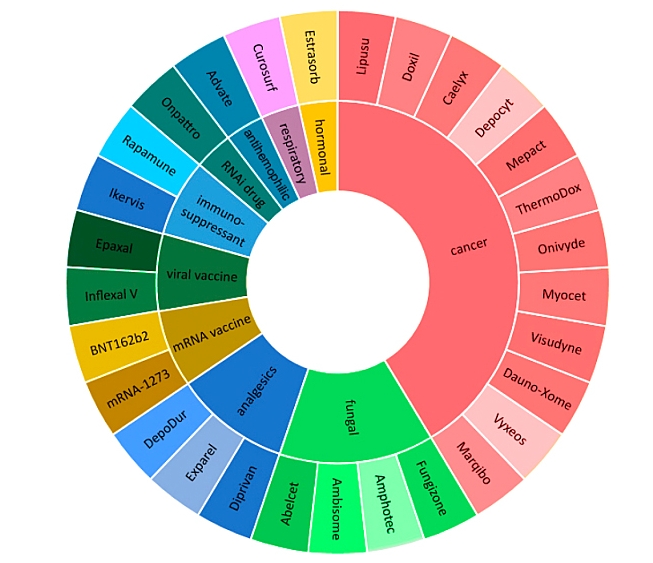 半個多世紀以來,脂質體一直被認為是醫學的強大工具,能夠將治療藥物可控地封裝并輸送到體內特定位置,這使得它們可用于治療各種疾病。許多LNP藥物制劑已獲批上市并用于醫療實踐(圖1)。根據最近的市場分析以及基于LNP的已上市藥物信息,全球脂質體藥物遞送市場的主要參與者如圖2所示。